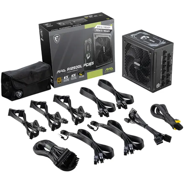 MSI MAG A1250GL PCIE5 Power Supply 1250W, 80 PLUS Gold, 135 mm Fan Size, Protections: OCP/OVP/OPP/OTP/SCP/UVP, Active PFC Design, Flat Cable Equipment, Dimensions: 150mmx150mmx86mm, 5Y Warranty, MAG_A1250GL_PCIE5